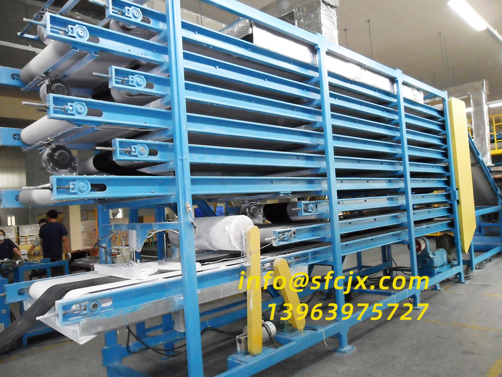 網帶式膠片冷卻機采用輸送帶全程輸送膠片,避免膠片在掛桿由于重力的拉伸,使用于生產高品質的膠片,可以適應生產1mm以下的膠片。該膠片冷卻機操作簡單、節省人工、全自動運行,不需用隔離劑槽冷卻。將膠片送入輸送帶后,橡膠片會在輸送帶上多層往復運行冷卻,然后經過涂粉隔離,最后裁斷、擺片或卷曲。